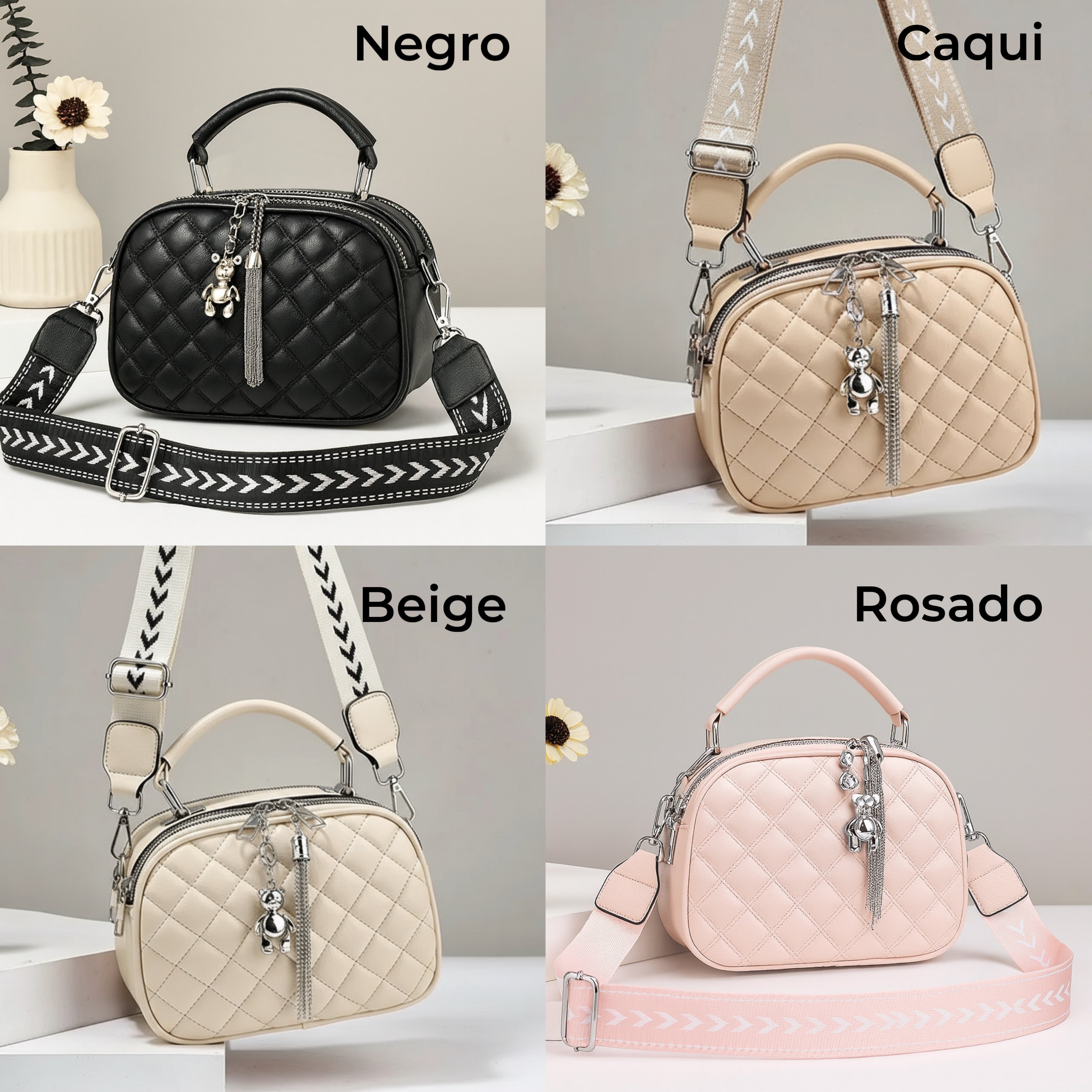 Disponible en 4 hermosos colores: beige, caqui, rosado y negro.